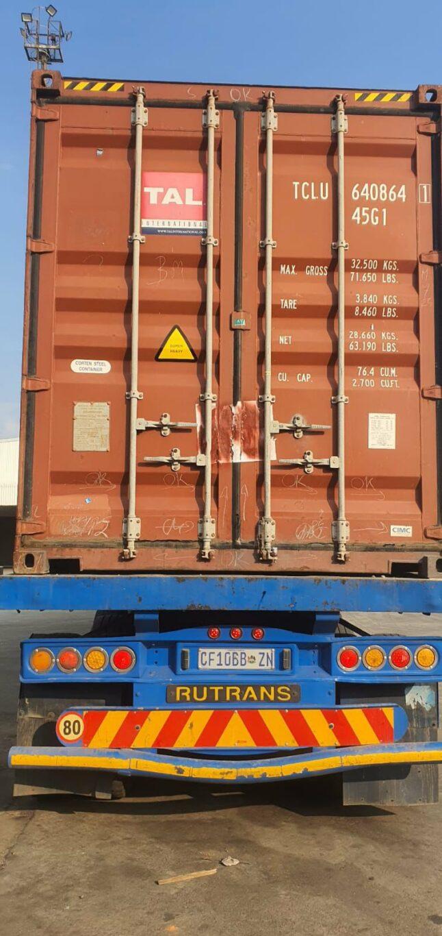 Both containers were loaded with tobacco and were on the trailers parked at a truck yard on Eastbury Drive in Eastbury. Information was received that two (2) Swazi Nationals had orchestrated the theft. The trailers are blue in colour with registration plates BC47ZVZN & CF10BBZN as seen in these images.